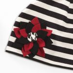 Cappello a righe bianco e nero in doppia felpa con applicazione di una margherita rossa e nera in lana cotta
