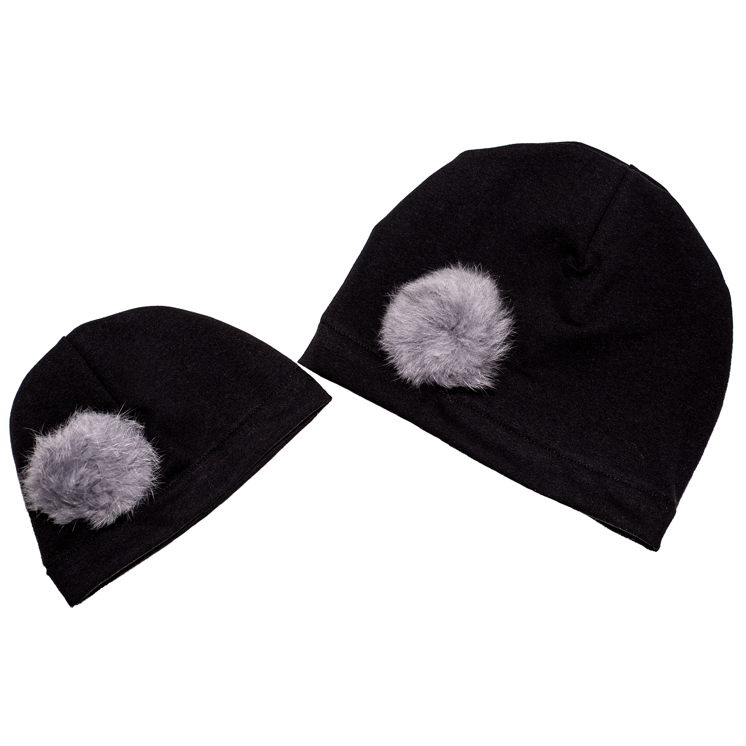 Cappello Mamma+Figlia nero con Pon Pon grigio