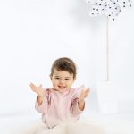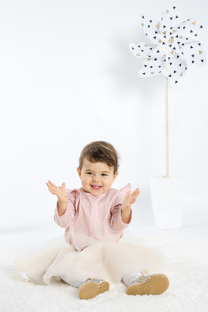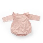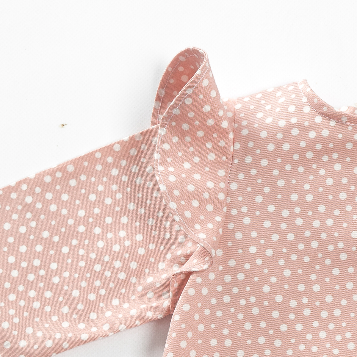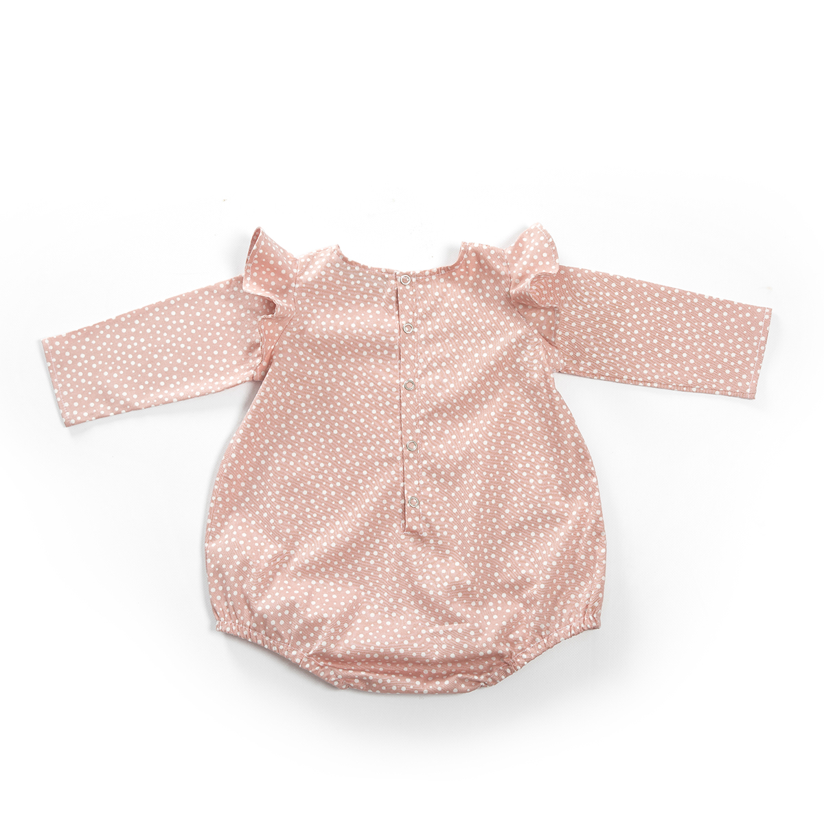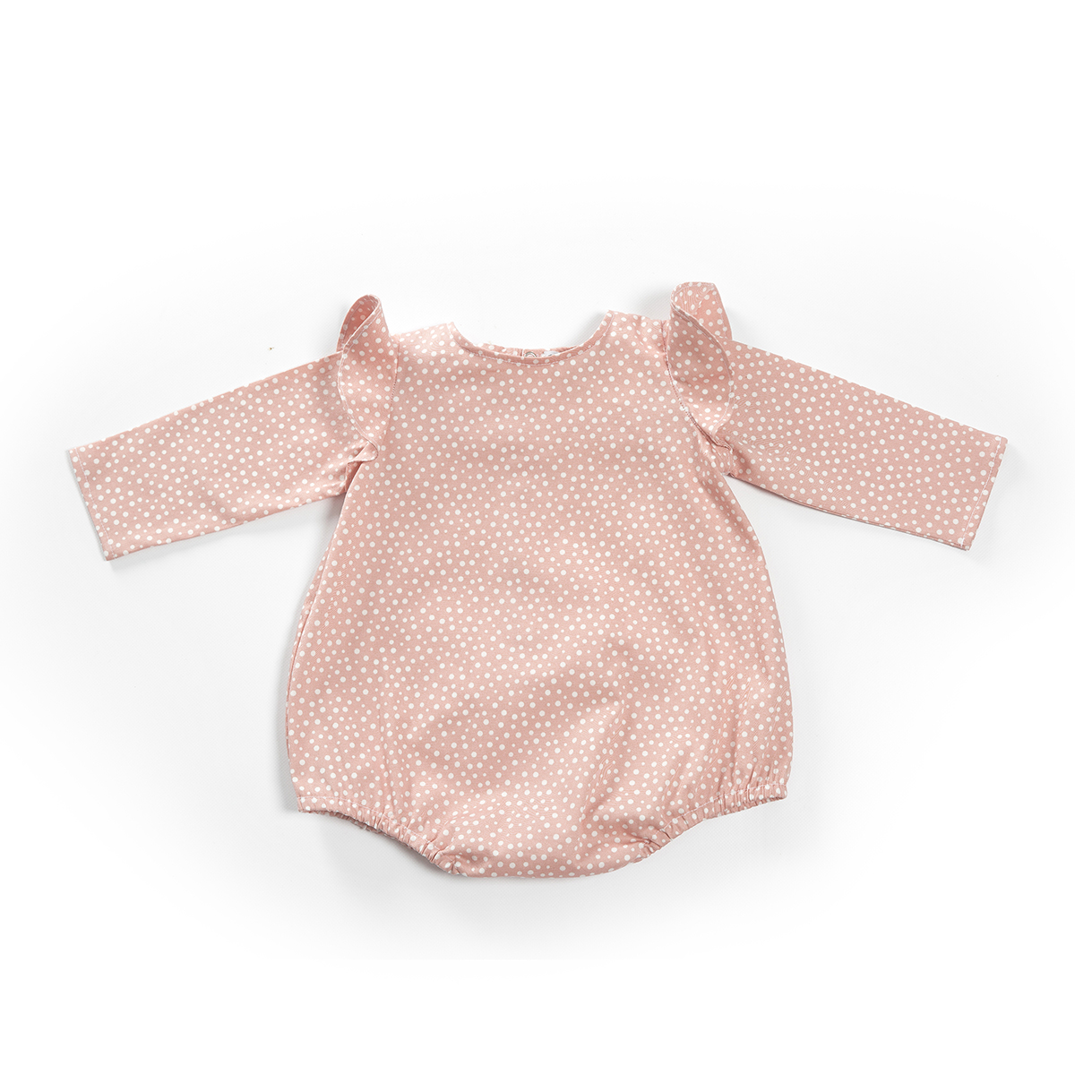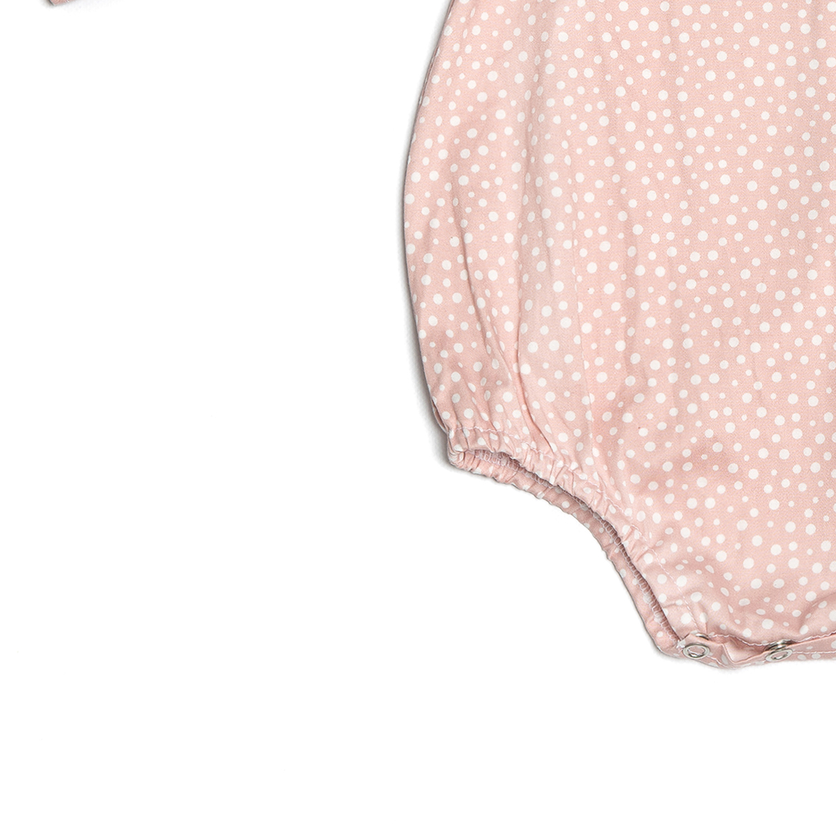 Spiritosa camicetta body in cotone, adornata di rouge sulle spalle nella variante rosa con pois crema.