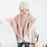 Mantellina in morbida e calda ecopelliccia rosa con fodera interna a righe bianche e cipria, automatici a chiusura sul davanti e laterali.