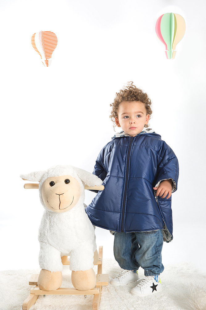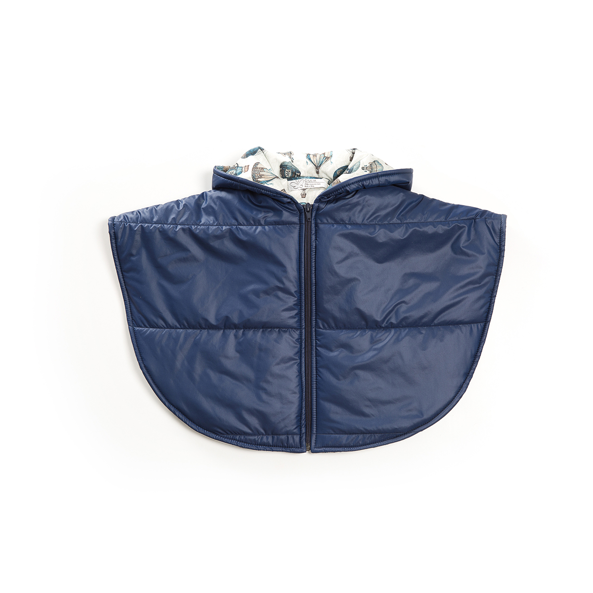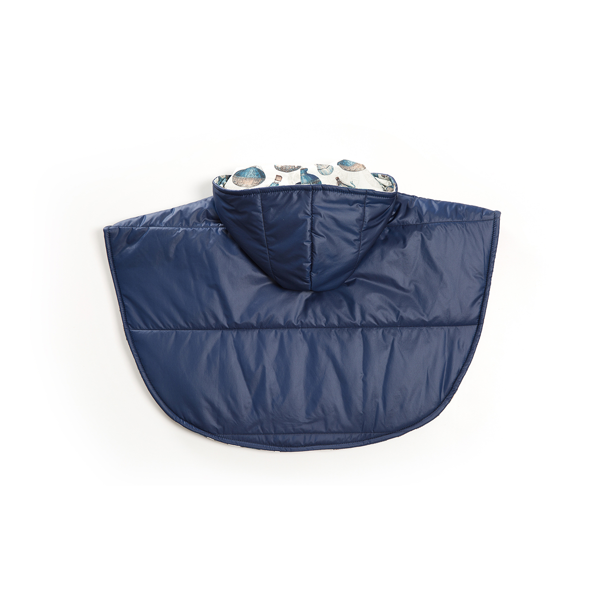 Mantellina in caldo piumino pesante con cappuccio non staccabile.