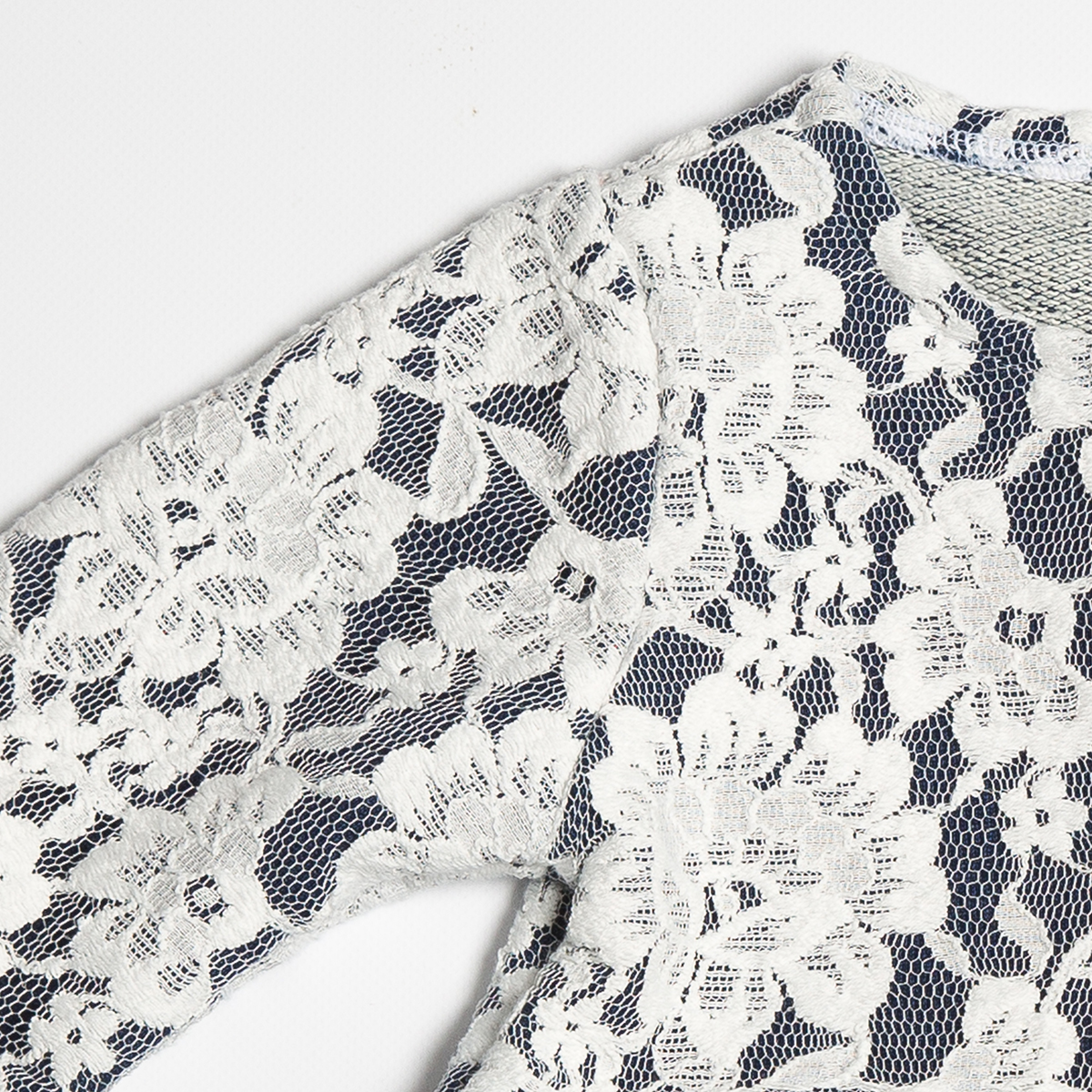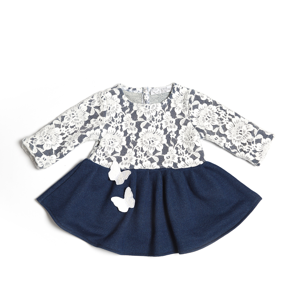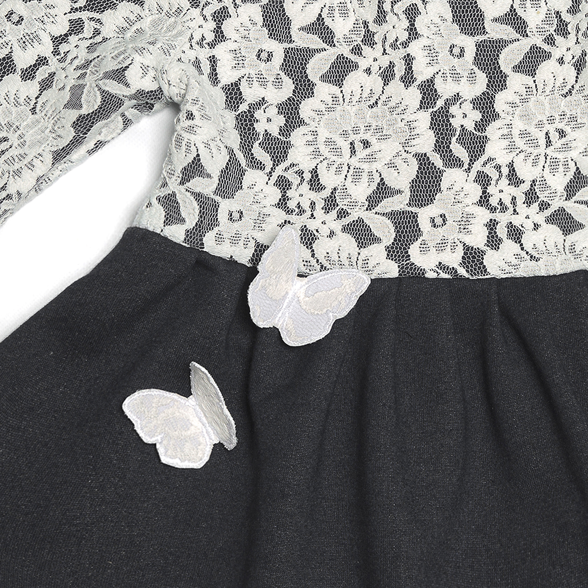 Delizioso abito in felpa con corpetto in pizzo bianco, adornato di farfalle di pizzo sulla gonna.