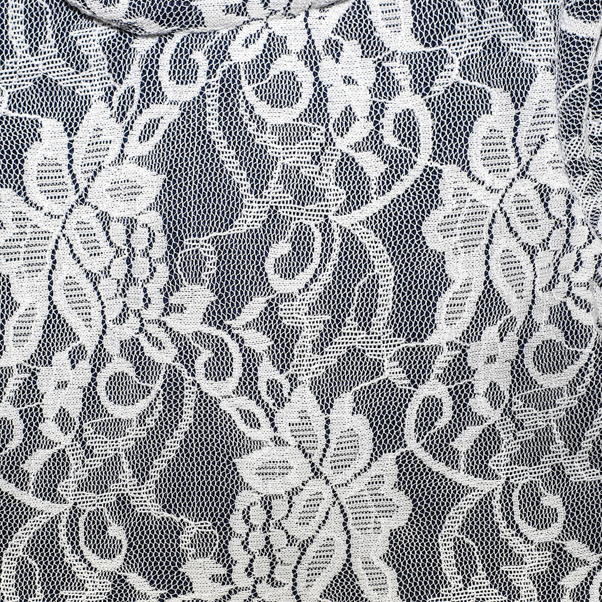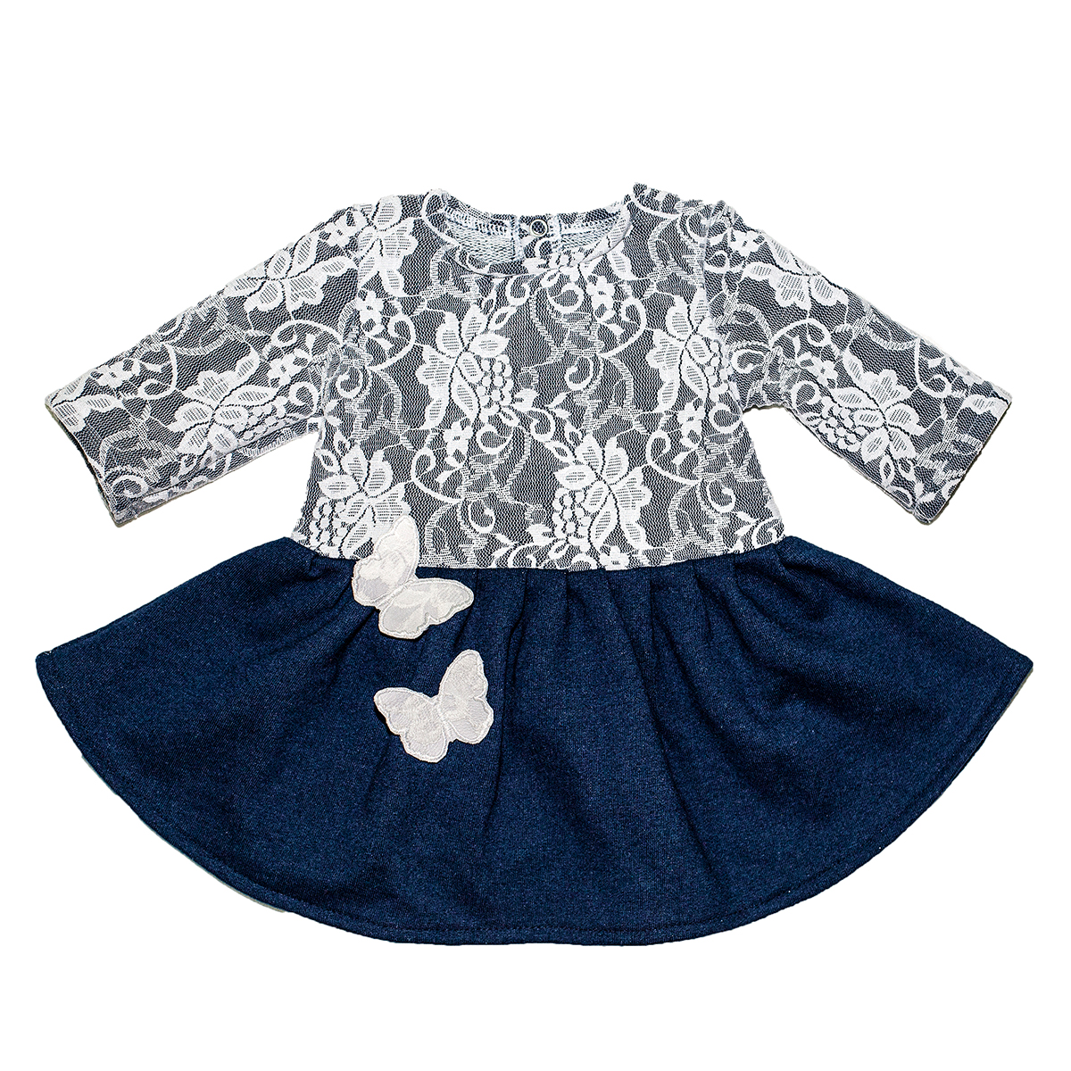 Delizioso abito in felpa con corpetto in pizzo bianco, adornato di farfalle di pizzo sulla gonna. Chiusura con automatici sul retro. Composizione: 95% cotone 5% elastan