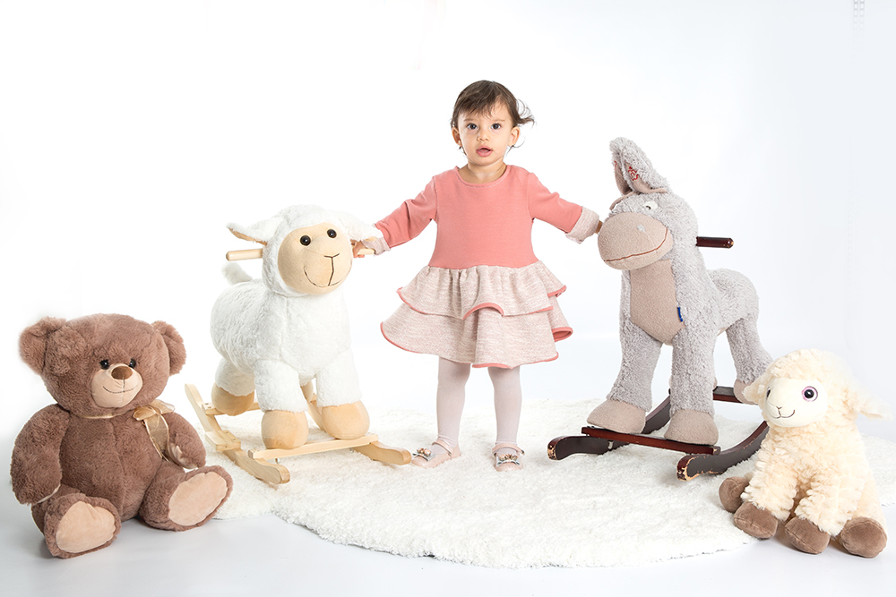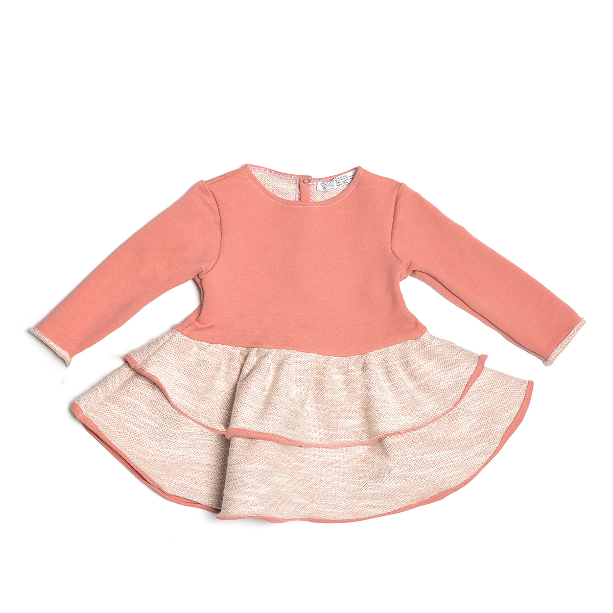 Spensierato abito in felpa rosa con manica con risvoltino e gonna a doppia balza a contrato bianca con glitter oro, che dona al capo luminosità. Chiusura con automatici sul retro. Composizione: 95% cotone 5% elastan